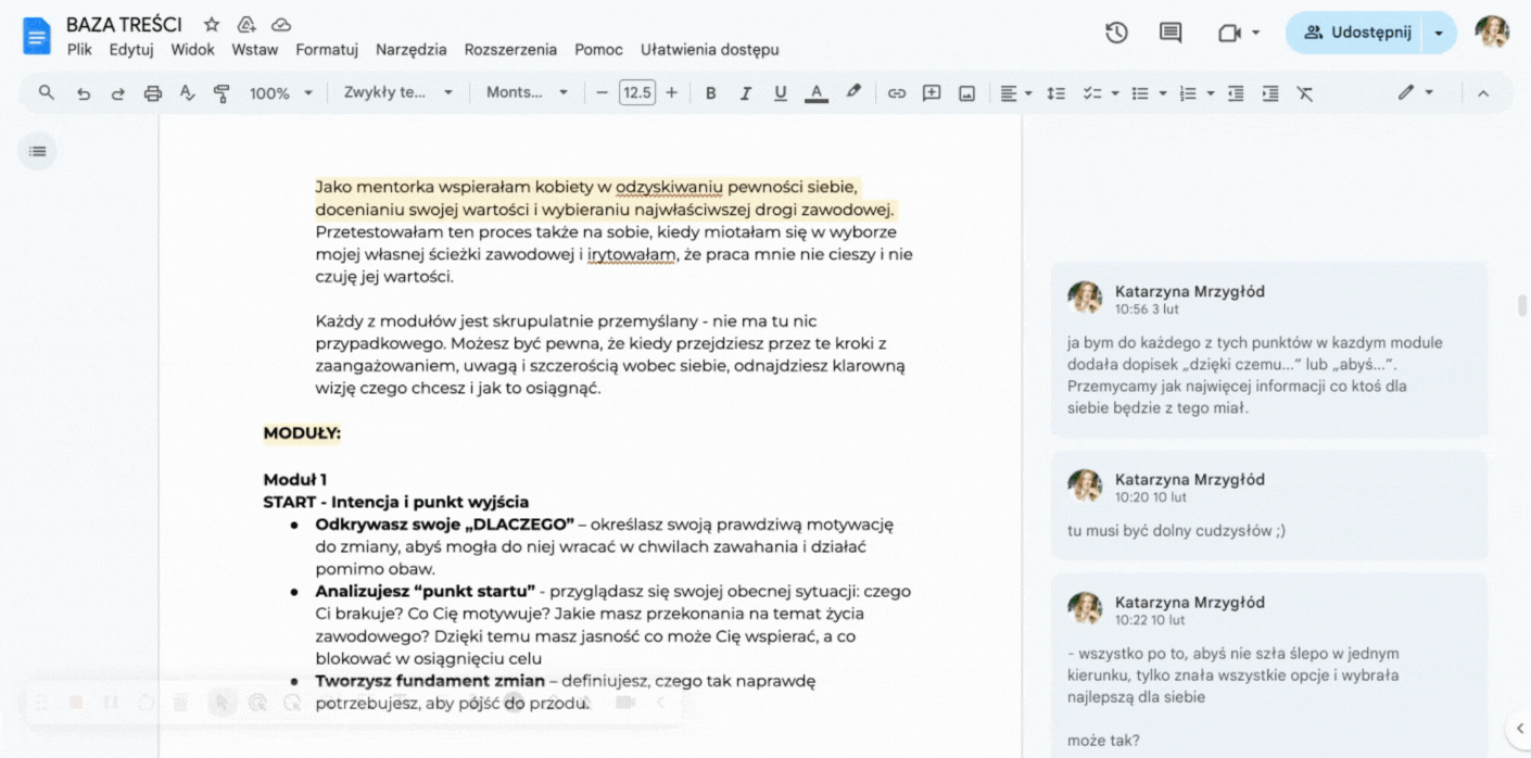 Bardzo doceniam pracę zaangażowanych osób i dlatego chętnie udzielam feedbacku do wypracowanych treści. Możesz mi wysłać swój uzupełniony zeszyt ćwiczeń, szkic artykułu na bloga lub kawałek innego tekstu, a ja dam Ci wskazówki w formie komentarzy w pliku Google Docs.