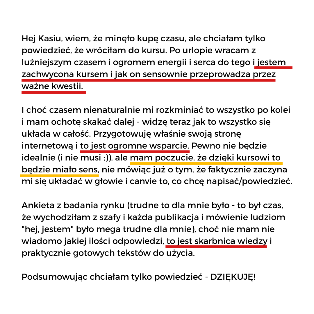 Jeśli po moim warsztacie pomyślałaś „Tak, to jest dokładnie to czego potrzebuję” i jesteś gotowa wreszcie zająć się na poważnie tworzeniem spójnej komunikacji marki, to mam nadzieję, że mój kurs online będzie dla Ciebie idealnym wsparciem.